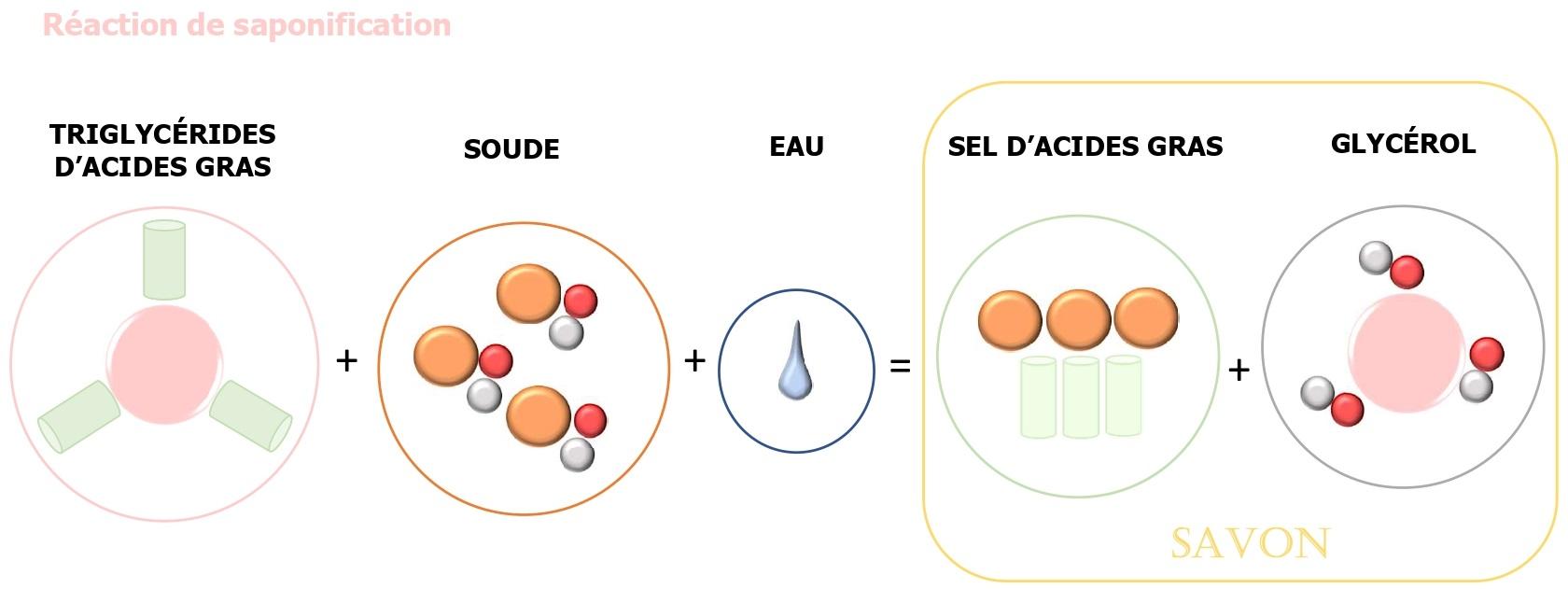 La saponification est une réaction chimique exothermique(qui libère de la chaleur) entre un corps gras, les huiles et beurres végétaux, et une base forte(la soude NaOH pour le savon solide ou la potasse KOH pour le savon liquide). Lors du processus de la saponification, les acides gras des huiles et des beurres se transforment en sels d’acides gras, et le glycérol des acides gras devient de la glycérine.