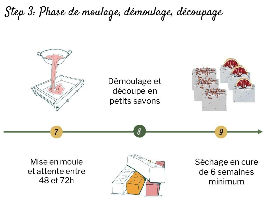 Après démoulage et découpe, les savons partent en cure environ 6 semaines pour sécherà souhait.